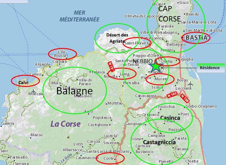 La location se situe en Haute Corse entre Saint Florent et Bastia, point de départ idéal pour découvrir le Nebbio, le Cap Corse, le désert des Agriates avec ses plages ( Saleccia, le Lodo )